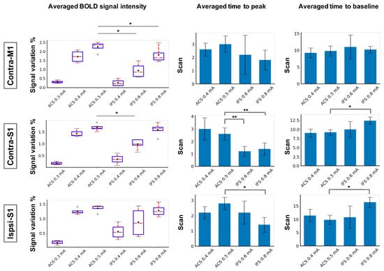 The variance of response amplitude was confirmed by an intermodality comparison of the peak intensities of the BOLD time course (Figure 5, left panel, one-way repeated measures ANOVA tests with Tukey post hoc analysis, ); at a comparable stimulus intensity (e.g., 0.4 vs. 0.4 mA, 0.5 vs. 0.6 mA), IFC stimulation was unlikely to elicit an analogous BOLD response relative to ACS, implying that IFC stimulation might not be as efficient as conventional brain modulation methods. In addition, we inspected temporal profiles of the induced BOLD response where no latency was observed following the onset of the stimulus, indicating that all these regions were activated almost simultaneously through inter- and intrahemispheric cortical pathways. The IFC stimulation could elicit a more rapidly ascending BOLD activation in contrast with ACS, which could be corroborated by comparing the averaged times to peak of the BOLD time series (Figure 5, middle panel, significant change in bilateral S1 and M1; ANOVA tests with Tukey post hoc analysis, *: , **: ). Conversely, a BOLD response triggered by IFC stimulation recovered to the resting state more slowly than ACS by examining the time to baseline (from the onset of the stimulus) across sessions (Figure 5, right panel, significant change in bilateral S1 but not M1; ANOVA tests with Tukey post hoc analysis, *: , **: ).