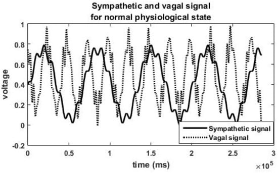 Figure 1 depicts the parasympathetic signal and the sympathetic signal generated for balanced sympathetic and parasympathetic activity (healthy). The solid line shows the sympathetic signal, and the dotted lines represent the vagal signal. This autonomic state is depicted by Equation (1) and corresponding simulated HRV features are listed in Table 2 (autonomic state 1). Vagal signal slightly outweighs the sympathetic signal in Figure 1. Slight parasympathetic dominance is observed in humans in resting conditions and sympathovagal balance corresponds to a healthy state [].