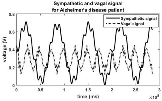 Simulated sympathetic signal and parasympathetic signal for an Alzheimer’s disease patient having Vagal inhibition and sympathetic dominance.