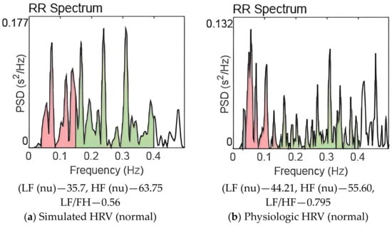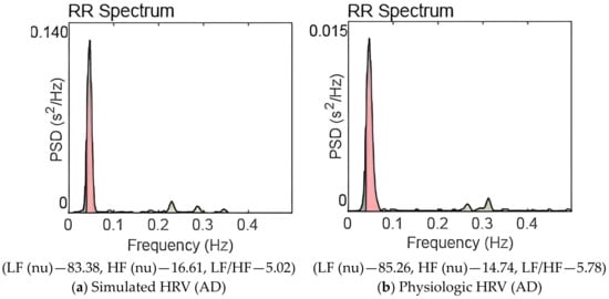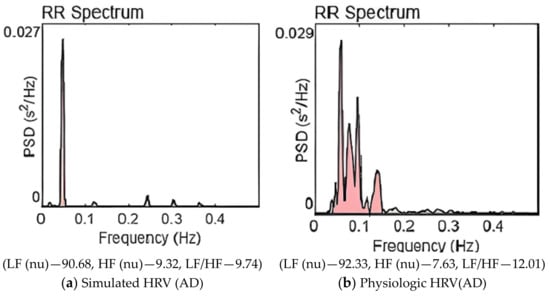 Figure 4a,b are the power spectra of simulated HRV and physiologic HRV corresponding to the AD disease state. In both cases, significant power is concentrated in the low-frequency band, and LF peak frequency is also present. The power in the HF band has been reduced significantly; sympathovagal balance is lost. When Figure 3 and Figure 4 are compared, we can observe the decline in the high frequency content in Figure 4.