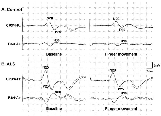 Representative waveforms of the median nerve somatosensory evoked potentials (SEPs) in a control subject (A) and a patient with amyotrophic lateral sclerosis (ALS) (B), recorded at rest (baseline) and during a task (finger movement). A+, F3/4, Fz, and CP3/4 represent the positions of electrodes on the scalp.
