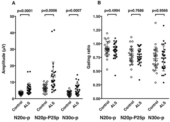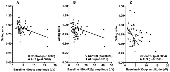 In control subjects, there was a significant negative correlation between baseline N20p–P25p and N30o–p amplitude and the gating ratio (p = 0.0028 and p = 0.0054, respectively; Pearson’s correlation efficient; Figure 4B,C), but no significant correlation between baseline N20o–p amplitude and the gating ratio (p = 0.0660; Figure 4A). In patients with ALS, there was a significantly negative correlation between the baseline N20o–p and N20p–P25p amplitude and the gating ratio (p = 0.0040 and p = 0.0019, respectively: Figure 4A,B), but no significant correlation between baseline N30o–p amplitude and the gating ratio (p = 0.1081; Figure 4C).