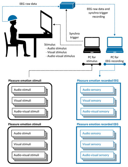 There are three stimulus modalities for inducing their respective sensory modalities: audio, visual, and audio-visual. The audio stimulus modality provided audio information from the emotion videos, the visual stimulus modality provided visual information from the emotion videos, and the audio-visual modality provided audio and visual information from the emotion videos. Hence, we had two types of emotions (pleasure or displeasure) and three stimulus modalities (audio, visual, and audio-visual) for inducing EEG data. The collected cross-sensory emotion EEG data can be described as follows: pleasure EEG (audio/visual/audio-visual sensory) and unpleasure EEG (audio/visual/audio-visual sensory). The experimental setup is illustrated in Figure 2. Twenty healthy participants were recruited for the experiment. The experimental details and data validation have been described in previous studies [33]. Detailed information on the cross-sensory EEG emotion data is presented in Table 1.