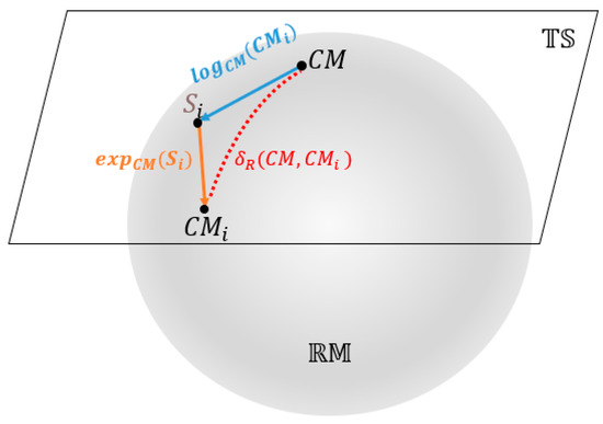 Features extracted from the Riemannian tangent space have better discriminative properties and are easier to handle than the original Riemannian space features. This is primarily due to their linear properties and enhanced discriminability. The Euclidean distance and linear classifiers can be directly applied in the tangent space because the space is linear, and linear operations have simpler expressions. Additionally, the projection operations in the tangent space highlight the differences between the sample classes, improving feature discriminability. In contrast, the original Riemannian space may have smaller differences between sample classes, with lower feature discriminability. The features of this study are the tangent-space CMs. Therefore, from Equations (3) and (4), the original Riemannian space can be transformed into tangent-space —using Equation (5), known as the log-Euclidean mean covariance [17].