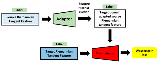 The features from the target and source domains were extracted using the Riemannian tangent space methods. Previous research has indicated that the original GAN loss is vulnerable to collapse during training sessions. Meanwhile, the emotion-corresponding labels in this study were pleasure and displeasure, regardless of sensory modality. Feature adaptation can fit each emotion label corresponding to the target domain rather than the emerged target domain. Inspired by Wasserstein generative adversarial networks [52] and adding label information as conditions, the proposed adversarial domain adaptation framework is indicated in Figure 6.