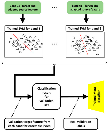 The target and adapted source features for each band constituted the training data corresponding to each SVM classifier. After the training session, six SVMs were trained for each of the six bands.