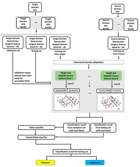 After executing domain adaptation, the adapted source and target-domain features were used with the corresponding bands. The adapted source and target-domain features are recognized as Riemannian domain target features; therefore, the SVM with polynomial kernels had a considerable discriminative performance for these specific features [58]. Therefore, we explored polynomial kernel SVMs for each band feature to obtain trained SVM classifiers for emotion recognition. Moreover, six trained SVMs corresponded with the six bands to ensemble the six SVMs’ results into final emotion recognition outputs. The proposed classification strategies are illustrated in Figure 7.