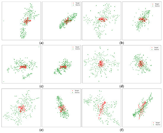 Visualization of target-domain features and original/adapted source-domain features. Red points were target domain features; green points were source domain features. For (a–f), The left subfigures are target domain features and original source domain features, the right subfigures are target domain features and adapted source domain features. From the target domain features (a): sub01; audio; 1–4 Hz, (b): sub04; audio-visual; 4–8 Hz, (c): sub17; visual; 8–13 Hz, (d): sub11; visual; 13–20 Hz, (e): sub05; audio; 20–30 Hz, (f): sub10; audio-visual; 30–50 Hz, the source domain features were the corresponded subject, filter banks and the rest of two sensory conditions.