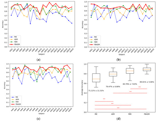 Cross-sensory emotion recognition results from RIE, ADR, FBR, and FBADR. The classification results for each subject with the target domain as audio, visual, and audio-visual are (a–c), respectively; (d) is the average accuracy of 20 subjects and three sensory modalities, the text in (d) indicate the of the accuracies.