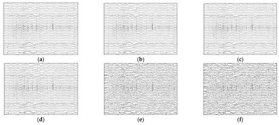 Temporal presentation of the noised signals; data are from the first 5 s of sub 01 audio-happy condition with 1–50 Hz filtered. (a) Original data without noise. (b) Noised data with . (c) Noised data with . (d) Noised data with . (e) Noised data with . (f) Noised data with .