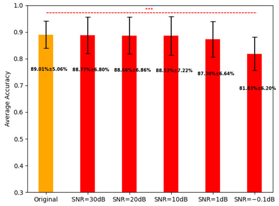 Figure 14 indicates that with the noised data of , the average accuracy reached and , respectively. For further statistical analysis a one-way ANOVA was used to determine the statistical difference between the accuracy of the original data and the five-group noised data; were determined from the five pairs as follows: original—, original—, original—, original—, original—. A denoted as *** in Figure 14, was considered significant. The robustness of the proposed methods could ensure high cross-sensory recognition performance under , making it viable for real-time EEG-aBCI application.