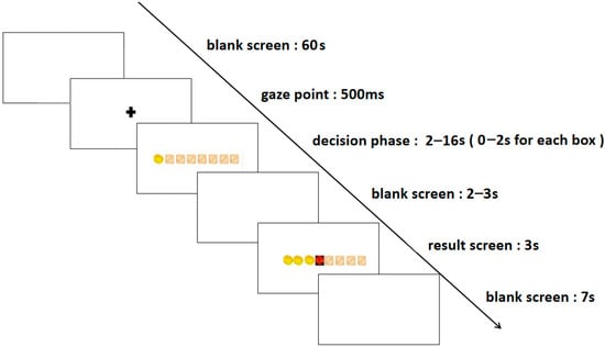 The formal experiment was divided into two blocks: the high-risk level and the low-risk level, with each block consisting of 50 trials, culminating in a total of 100 trials. In the low-risk level trials, participants earned one gold coin per chest, while in the high-risk level trials, they were awarded three gold coins per chest. The experiment commenced with a rest period, during which a blank screen was displayed for 60 s, succeeded by a 500 ms fixation point. Subsequently, eight boxes appeared on the screen, ushering participants into the decision phase. In this phase, they had to choose whether to continue opening boxes or to stop. Opting to stop opening boxes signified preserving the gold coins acquired from previous openings. Conversely, continuing to open boxes presented the potential for additional gold coins but also the risk of encountering demons, which would result in the loss of all earnings in that round. Each box had a decision time frame of 0–2 s, and the decision phase for each trial lasted 0–16 s. This was followed by a 2–3 s blank screen and a result presentation screen. The result presentation screen displayed the outcomes for 3 s, succeeded by a 7 s blank screen before transitioning to the next trial. The entire experiment was conducted within a span of 30–40 min. The specific stages of the process are depicted in Figure 1.