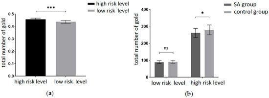 (a) Total number of gold coins at different levels of risk. (b) Total number of gold coins for the two groups of participants at different levels of risk (*** = p < 0.001, * = p ≤ 0.05, ns = no significant).