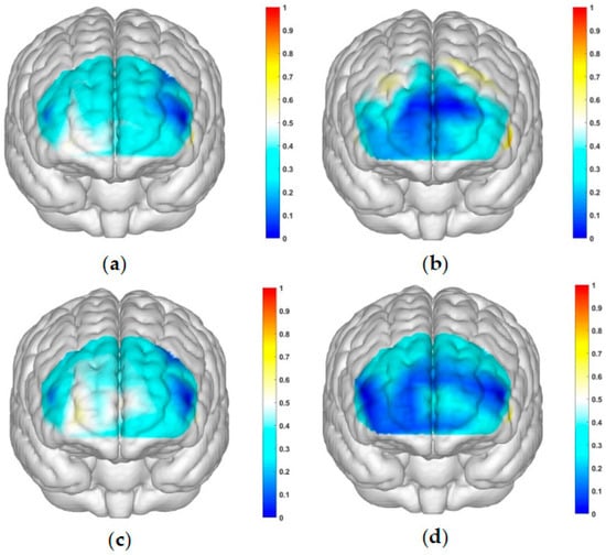 Activation maps of the measured brain regions, OFC and dlPFC, within the control group. (a) Represents the control group under condition 1: high-risk level with a gain outcome; (b) represents the control group under condition 2: high-risk level with a loss outcome; (c) represents the control group under condition 3: low-risk level with a gain outcome; and (d) represents the control group under condition 4: low-risk level with a loss outcome.