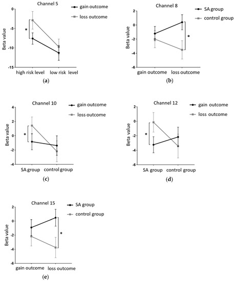(a) Interaction between the amount of risk and the outcome in Channel 5; (b) Interaction between the group type and the outcome in Channel 8; (c) Interaction between the group type and the outcome in Channel 10; (d) Interaction between the group type and the outcome in Channel 12; (e) Interaction between the group type and the outcome in Channel 15 (* = p ≤ 0.05).