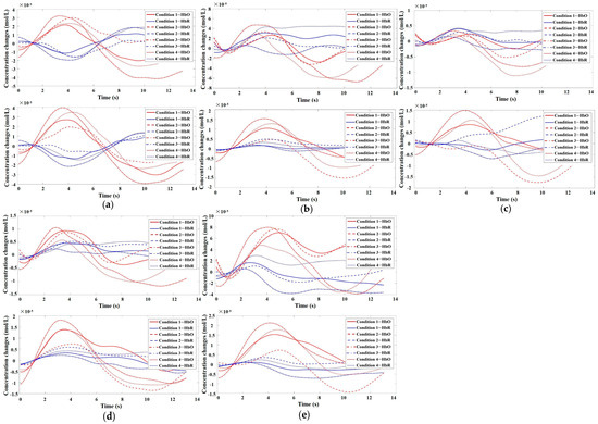Time series plots of HbO/HbR for participants in Channels 5, 8, 10, 12, and 15. (a) Time series plot of HbO/HbR for participants in Channel 5. The top graph represents the addiction group, while the bottom graph represents the control group; (b) Time series plot of HbO/HbR for participants in Channel 8. The top graph represents the addiction group, while the bottom graph represents the control group; (c) Time series plot of HbO/HbR for participants in Channel 10. The top graph represents the addiction group, while the bottom graph represents the control group; (d) Time series plot of HbO/HbR for participants in Channel 12. The top graph represents the addiction group, while the bottom graph represents the control group; (e) Time series plot of HbO/HbR for participants in Channel 15. The top graph represents the addiction group, while the bottom graph represents the control group.