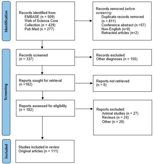 A total of 1215 publications were identified, of which 182 full texts were evaluated (Figure 1). In the present systematic review, 111 studies were included.
