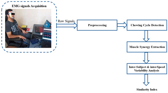 The step-by-step procedure of muscle synergies analysis during chewing can be described as follows: EMG signal acquisition, preprocessing, chewing cycle detection, muscle synergy extraction, inter-subject and inter-speed variability. Figure 1 displays the framework of the proposed muscle synergy extraction analysis.