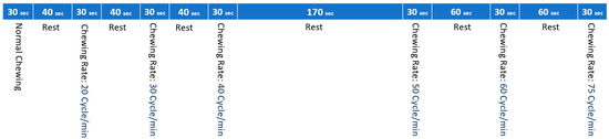 The experiment included two blocks with six different speeds (20, 30, 40, 50, 60, and 75 cycles/min), and an in-house program controlled the chewing rate. The chewing was accomplished with the right and left sides in the first and second blocks, respectively. The timeline of chewing in each block is illustrated in Figure 2. All volunteers sat comfortably in front of the monitor and were instructed to follow the chewing rates with video and audio cues representing each chewing cycle start.