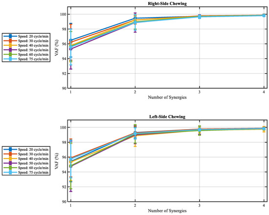 Synchronous muscle synergies varying from one to four for all participants and speeds were extracted by the NMF approach. Two sets of muscle synergies as the appropriate number of muscle synergies (VAF (%) > 98%) for all participants at various chewing speeds by right and left side were identified (Figure 4). Therefore, two muscle synergies can produce initial EMG patterns for all speeds. Furthermore, it can be hypothesized the muscle activation patterns were a combination of two synchronous muscle synergies with a specific scaling coefficient.