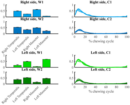 EMG signals of each chewing cycle were rectified and smoothed with a low-pass filter with a cutoff frequency of 10 Hz to obtain EMG envelopes. The EMG envelopes were resampled at 240 Hz. The amplitude of the EMG envelopes for each muscle was normalized to the average peak value over all cycles. Afterward, non-negative matrix factorization (NMF) [33,51,52] was performed for consecutive chewing cycles to extract synchronous muscle synergies. The EMG matrix (M) was decomposed into spatial muscle weightings (W), which are referred to as the muscle synergies and their temporal activation patterns (C) by NNMF according to (2).
