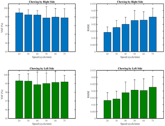 The quality of the EMG activation pattern reconstruction by combining two muscle synergies of all participants at each speed during right and left-side chewing is illustrated in Figure 7. Furthermore, the VAF of muscle synergies for each participant at all speeds is reported in Figure 8.