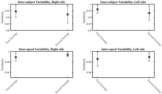 The similarity criterion was employed to explore the comparison of muscle synergies. The maximum normalized scalar product between synergy activation coefficients was described as the similarity between two groups of muscle synergies. Figure 9 displays the similarity of all participants and all speeds, known as inter-subject and inter-speed variability, respectively.