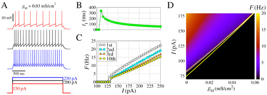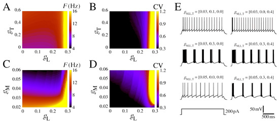 In Figure 1D, we show F (in color) as a function of and I, where F (Equation (14)) is calculated considering spikes in a time window of 5.0 s. The has a great influence on the way the neuron fires by changing the minimum value of I, where (white line), and in addition, higher values of have lower values of F for the same value of I. This shows that the slow K+ current (), related to the adaptation of the spike frequency, has a strong influence on the response of the neuronal firing to external stimuli. On the other hand, low-threshold calcium currents () have low alterations in F (yellow line), and high-threshold calcium currents () have an almost null effect (brown line).