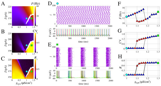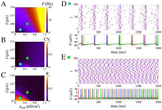 In Figure 3, we present a systematic study of the parameter combinations of constant applied current and the chemical synaptic conductance (I and ) in the measures F, CV, and R (see Section 2.3). These measures are displayed, respectively, in Figure 3A–C. Notice that here, we purposely remove the effect of to show that without the slow potassium and calcium currents, there is no burst no matter the input amplitude and coupling (Figure 3B). Moreover, the firing rate increases with I and (Figure 3A). Interestingly, however, as seen in Figure 3C,D, even without the effect of , the raster plot shows a synchronized behavior with activity around 4 Hz due to population dynamics. This is noticed for combined low values of input current I and , whereas for higher values, only asynchronous behavior is observed (Figure 3E).