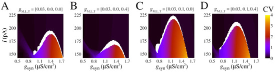 Effect of calcium currents in the burst synchronization in space parameters as a function of input current (I) and chemical synaptic conductance (). (A–D) Coefficient of variation (CV) for different combinations of (see values atop). (A) Model with slow potassium and without calcium currents, the same parameters of Figure 4. (B) Model with slow potassium and only low-threshold calcium current (). (C) Model with slow potassium and only high-threshold calcium current (). (D) Model with slow potassium and both low-threshold and high-threshold calcium currents ( and ).