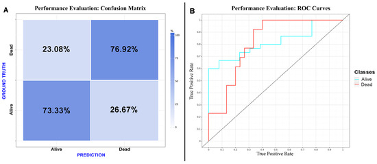 Figure 4. Performance evaluation: (A) confusion matrix of the CNN considering “dead” as a positive result for the test; (B) receiver operating characteristic curve of the CNN.