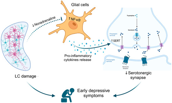 Locus coeruleus (LC) damage culminates in a reduced anti-inflammatory action of noradrenaline on the glial cells resulting in pro-inflammatory cytokine release, which induces a serotonergic impairment by increasing the serotonin uptake. Together, noradrenergic and serotonergic deficits may result in early depressive symptoms observed in Parkinson’s Disease. NF-κB = nuclear transcription factor nuclear factor kappa B; SERT = serotonin transporter.