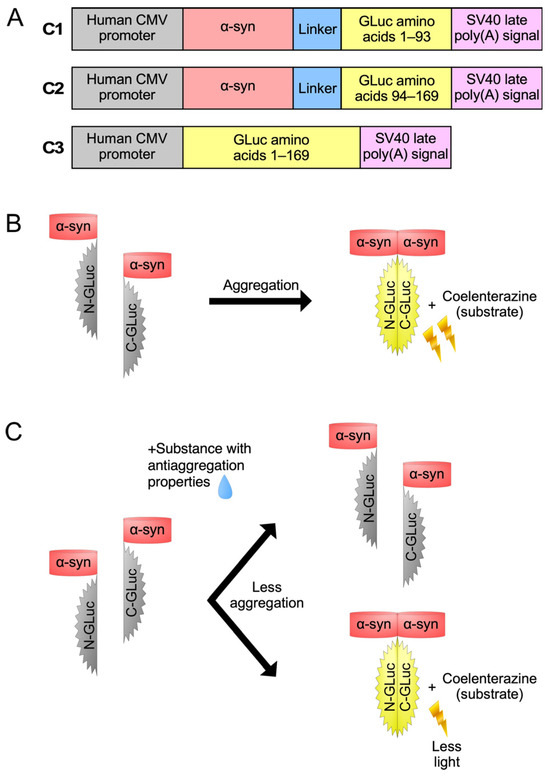 - C2: It contains the sequence encoding the α-syn ORF fused with a 30 bp linker, followed by the sequence encoding the carboxyterminal part (amino acids 94–169) of GLuc protein, as described in [31].