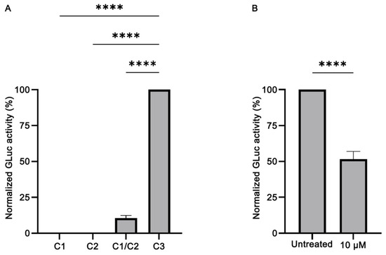 Normalization was performed by dividing the RLU value of GLuc of each well by the RLU value of FLuc of the same well. Each experiment included at least two technical replicates and was repeated at least thrice. Results were expressed as mean ± SD. Statistical analyses were performed by one-way ANOVA for multiple comparisons and by student’s test for the comparison between two groups, using GraphPad Prism 10.1.2. Differences were considered significant at p ≤ 0.01.