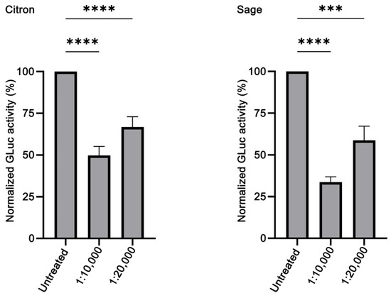 Evaluation of the anti-aggregating properties of Citrus medica (citron) and Salvia officinalis (sage) EOs in HeLa cells. The restored GLuc activity obtained by C1/C2 co-transfection is reduced in a concentration-dependent manner upon treatment with both citron (n = 4, **** p < 0.0001) and sage (n = 3, *** p ≤ 0.001, **** p < 0.0001) EOs at the indicated dilutions. The GLuc activity of the untreated sample was set as 100%.