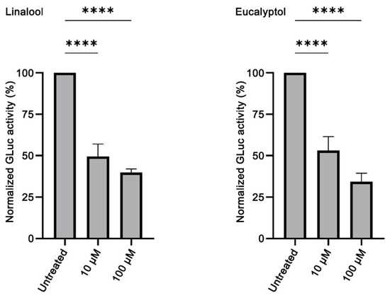 HeLa cells were routinely cultured in DMEM (Biosera, Nuaille, France) containing 10% v/v fetal bovine serum (Gibco, Waltham, MA, USA), 100 U/mL penicillin and 0.1 mg/mL streptomycin (Biosera, Nuaille, France) and 2 mM glutamine (Biosera, Nuaille, France) and maintained at 37 °C in a humidified incubator with 5% v/v CO2/ 95% v/v air. Cells were seeded in 96-well plates (Corning, New York, NY, USA) at a density of 8000 cells per well and the next day were transfected with 50 ng DNA using the JetPRIME reagent according to the manufacturer’s instructions (Polyplus, Illkirch-Graffenstaden, France). In all transfections, 5 ng of the pFLuc plasmid used for normalization was also added. Then, 24 h after transfection, the EOs or their constituents were diluted in DMEM at a specific dilution, and 10 μL was dispensed into each well. Cells were incubated for 48 h, and then the supernatant (the cell medium) was collected for GLuc assays, while the cells were lysed for FLuc assays. GLuc and FLuc assays were performed as described below.