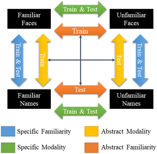 24] was used in a cross-classification scheme. To determine invariant familiarity, we trained the classifier with familiar faces vs. unfamiliar faces and tested it with familiar names vs. unfamiliar names and vice versa. To determine invariance across modalities, the classifier was trained with familiar faces vs. familiar names and tested with unfamiliar faces vs. unfamiliar names, and vice versa. In total, four different classifications were performed, two each for familiarity and modality. In addition, specific classifications were made to analyze the familiarity of faces and names.