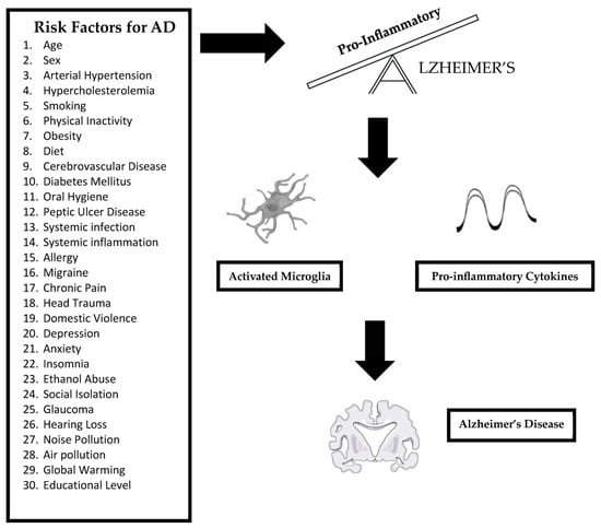 Herein, an overview of the neuroimmune–neuroinflammation axis as related to AD is presented followed by a consideration of the 30 risk factors for AD in conjunction with a description of their neuroinflammatory mechanisms (Figure 1).