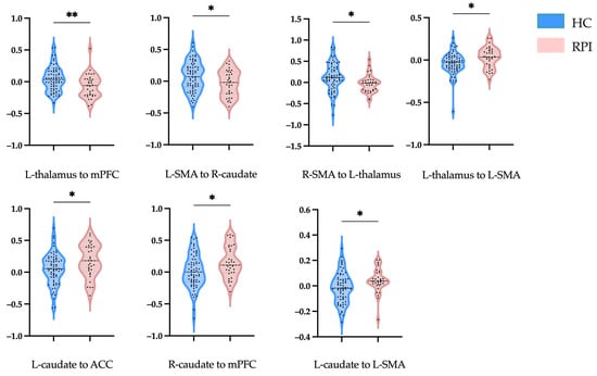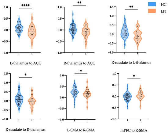 | L-thalamus to L-SMA | −0.039 ± 0.128 | −0.295 ± 0.121 | 0.010 | −2.634 |