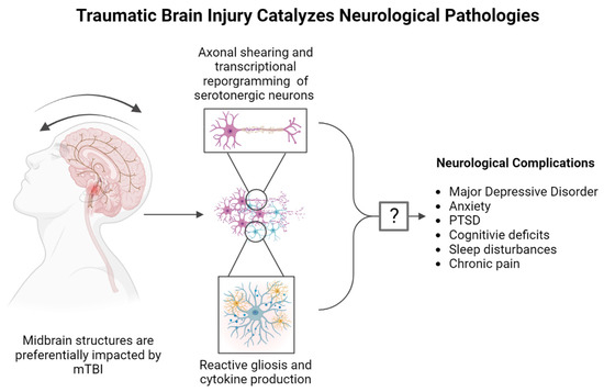 Though the mechanisms underlying TBI-elicited neuropsychiatric disturbances have not been experimentally resolved, ongoing preclinical and clinical experimental paradigms interrogating the midbrain have identified a rich landscape of neurons that produce 5-HT, expansively project to disparate regions of the brain, and exert global influence over a plethora of behavioral and physiologic phenotypes [21]. As depicted in Figure 1. the molecular effects of TBI on populations of brainstem serotonergic neurons and elicits long-term neurological complications remains a domain of intense scientific inquiry, as the delineation and characterization of these neurons is simultaneously ongoing.