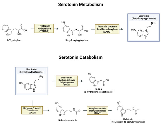 - Walther, D.J.; Peter, J.U.; Bashammakh, S.; Hortnagl, H.; Voits, M.; Fink, H.; Bader, M. Synthesis of serotonin by a second tryptophan hydroxylase isoform. Science 2003, 299, 76. [Google Scholar] [CrossRef]