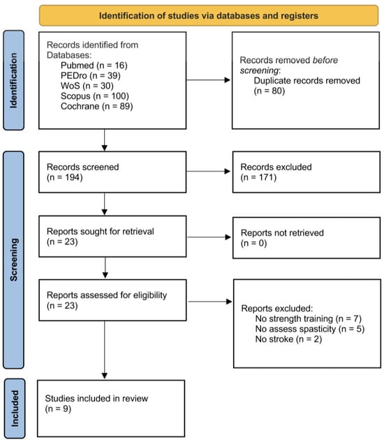 | PubMed | 16 | (“stroke” OR “cerebrovascular accident” OR “hemiparesis” OR “hemiplegia”) AND (“Resistance Training” OR “Strength Training” OR “strengthening”) AND (“Muscle Spasticity” OR “Muscle Hypertonia” OR “Spastic*” OR “Muscle Tonus”) Filter applied: Randomized Controlled Trial |