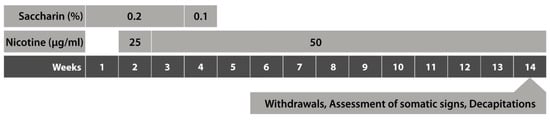 Forced oral nicotine treatment was started in the second week of the study (Figure 1). Rats in the nicotine exposure group were provided drinking bottles containing only nicotine dissolved in tap water, while those in the control group were provided drinking bottles containing pure tap water. Rats were given ad libitum access to the fluids in the bottles. Nicotine (Acros Organics, Thermo Fisher Scientific, Waltham, MA, USA, ditartrate dihydrate salt) treatment was initiated at 25 μg/mL (free base) in the second week and increased to 50 μg/mL (free base) in the third week. The rats were maintained at this dose for 11 weeks. The nicotine-containing water and tap water also included 0.2% saccharin in weeks 1, 2, and 3 and 0.1% saccharin in week 4. Saccharin was omitted from the drinking water in week 5 based on previous data showing the rewarding effects of saccharin []. The pH of nicotine- and saccharin-containing solutions was 7.4. All fluids in drinking bottles were replenished twice weekly.