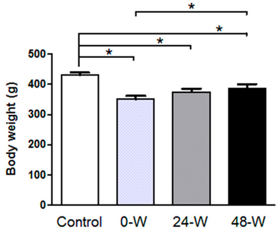 In our previous study, statistical analysis of the rats’ body weights measured weekly during chronic oral nicotine treatment showed no significant difference between the control and nicotine-treated groups before the initiation of nicotine administration. However, body weight was lower in the nicotine-treated group than in the controls starting from the first week of nicotine administration and continuing for the duration of treatment. Although the rats’ weight was also monitored during the withdrawal period, the effects of withdrawal on body weight were not analyzed []. In the present study, when final body weight measured just before sacrifice at week 14 was analyzed by one-way ANOVA, we observed a significant difference (F(3,36) = 8.737, p < 0.001) between the four groups. Duncan’s post hoc test revealed that control animals had significantly higher final weight than rats in the 48-W, 24-W, and 0-W groups, and those in the 48-W group also had a higher final weight compared to the 0-W group (p < 0.05; Figure 2).