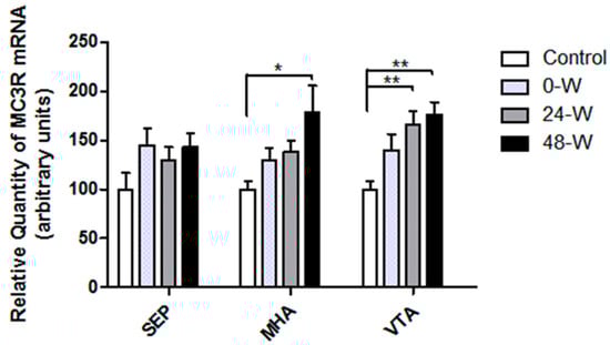 Comparison of MC3R mRNA levels in septum (SEP), medial hypothalamic area (MHA) and the ventral tegmental area (VTA), and in rats following chronic nicotine exposure (0-W), 24 h withdrawal (24-W), and 48 h withdrawal (48-W). Bars represent the mean ± standard error of mean; * p < 0.05, ** p ≤ 0.01 (n = 8–10 per group).