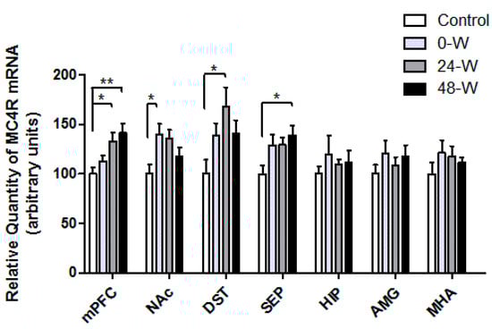The MC4R mRNA expression levels of the groups are compared in Figure 4. One-way ANOVA demonstrated significant differences in the expression of MC4R mRNA in the mPFC (F(3,33) = 5.156; p = 0.005), NAc (F(3,34) = 3.239; p = 0.034), DST (F(3,34) = 3.123; p = 0.039), and septum (F(3,32) = 3.254; p = 0.034). Post hoc comparisons using Tukey’s test demonstrated that MC4R mRNA expression in the mPFC was upregulated in the 24-W (p = 0.038) and 48-W (p = 0.007) groups compared to controls. In contrast, MC4R mRNA levels in the NAc were upregulated in the 0-W group when compared with controls (p = 0.042). In the DST, MC4R mRNA expression was higher in the 24-W group than in the control group (p = 0.022), whereas septum expression levels were higher in the 48-W group compared to controls (p = 0.03). No differences in MC4R mRNA expression were observed in the HIP, AMG, or MHA.