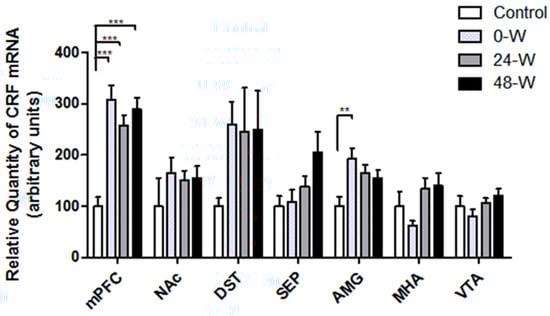 Comparison of CRF mRNA levels in the ventral tegmental area (VTA), medial hypothalamic area (MHA), amygdala (AMG), septum (SEP), dorsal striatum (DST), nucleus accumbens (NAc), and medial prefrontal cortex (mPFC) in rats following chronic nicotine exposure (0-W), 24 h withdrawal (24-W), and 48 h withdrawal (48-W). Bars represent the mean ± standard error of mean; ** p < 0.01, *** p < 0.001 (n = 7–10 per group).