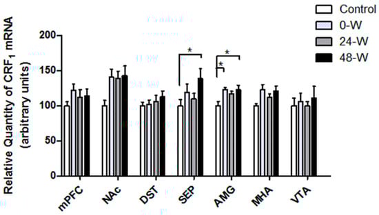 Comparison of CRFR1 mRNA levels in the ventral tegmental area (VTA), medial hypothalamic area (MHA), amygdala (AMG), septum (SEP), dorsal striatum (DST), nucleus accumbens (NAc), and medial prefrontal cortex (mPFC) in rats following chronic nicotine exposure (0-W), 24 h withdrawal (24-W), or 48 h withdrawal (48-W). Bars represent the mean ± standard error of mean; * p < 0.05 (n = 8–10 per group).