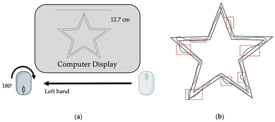 Task design. (a) Computer set-up with inverted handheld mouse positioned on non-dominant (left) side. (b) Example of completed trial attempt with error indicated.