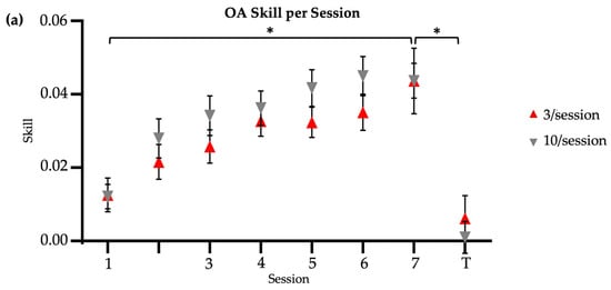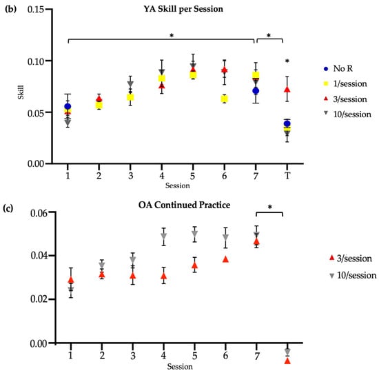 Skill score by session. * indicates significance at 0.05. Session 7 included retention (7) and transfer (T) tests. No R = no reactivation. (a) Older adults, main study. (b) Younger adults, reproduced from Johnson et al. (2022) []. (c) Older adults, continued practice.